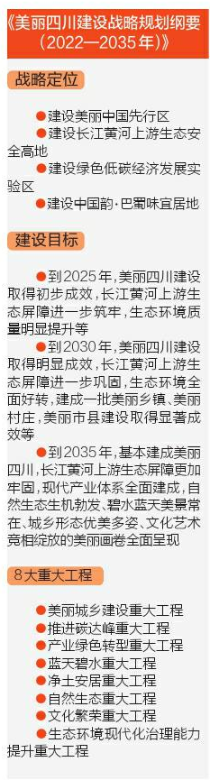 近日,省委、省政府印發《美麗四川建設戰略規劃綱要(2022—2035年)》(以下簡稱《綱要》),要求各地各部門以筑牢長江黃河上游生態屏障為統領,以推進綠色低碳經濟發展為支撐,扎實有序推進美麗四川建設,探索一條生態好、生活富、經濟優、文化興的發展道路,譜寫美麗中國的四川篇章。