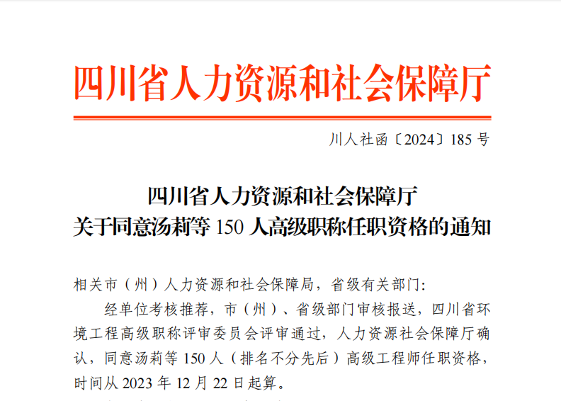 近日,四川省人力資源和社會保障廳發布了《關于同意湯莉等150人高級職稱任職資格的通知》。公司員工何雨明、張力、 韓健舟、徐雪梅、王波、羅斌等6名員工順利通過職稱評審,獲評高級工程師。在此,向他們表示熱烈祝賀!